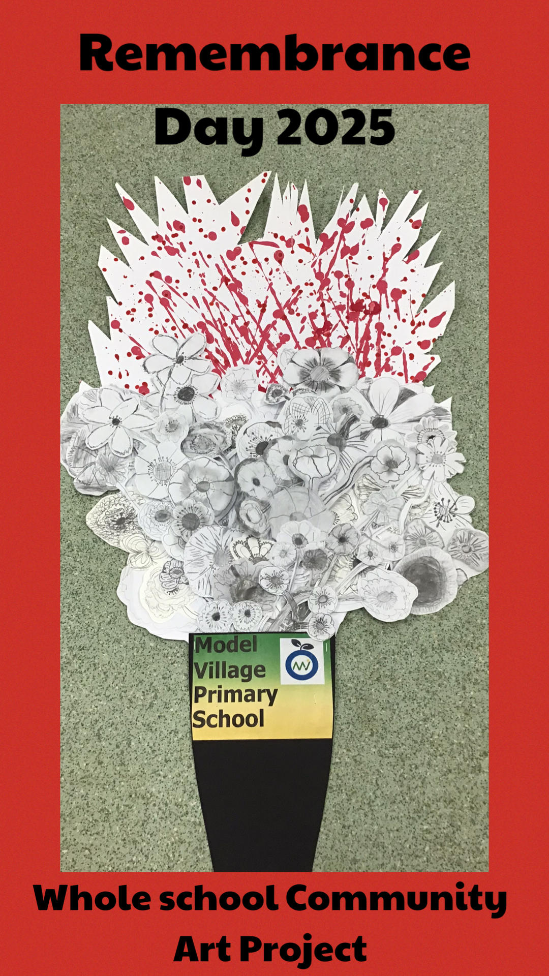 Each class, from the youngest pupils to Year 6, used their observational skills to draw poppies, reflecting on their symbolism of remembrance, resilience and hope. These beautiful pieces were then combined into one large collaborative artwork, a vase filled with poppies which represents unity, gratitude and peace.